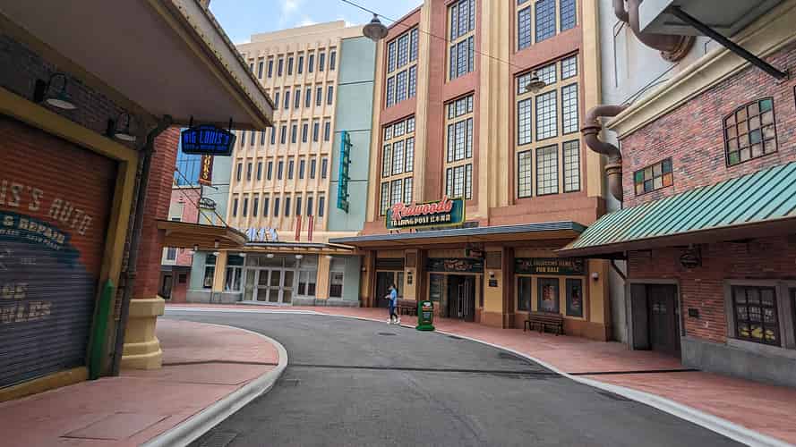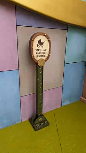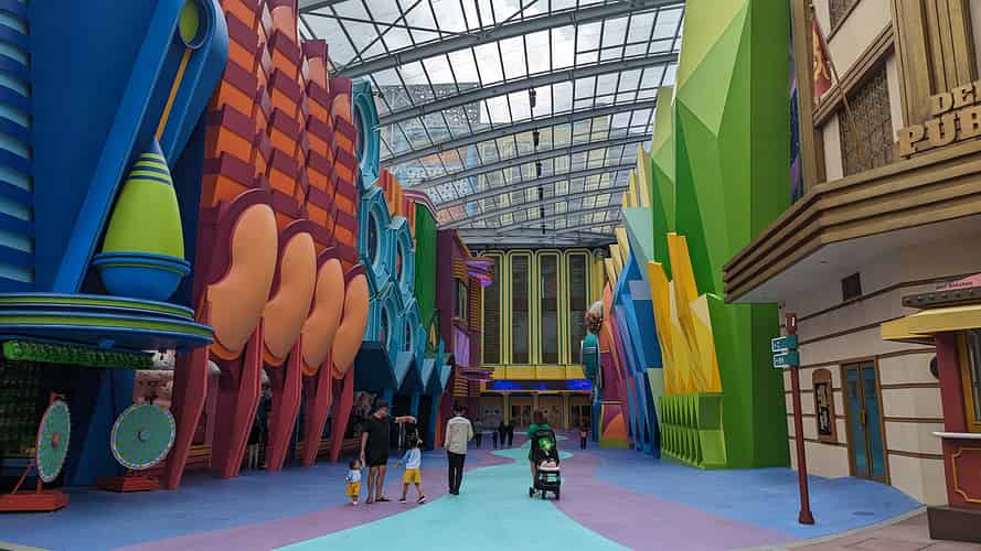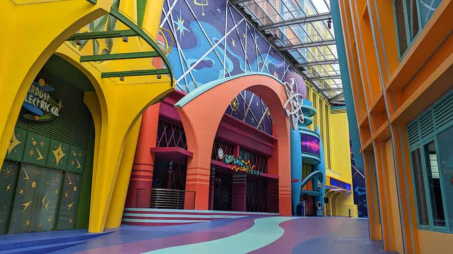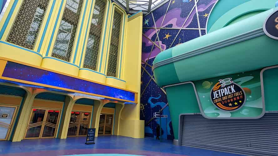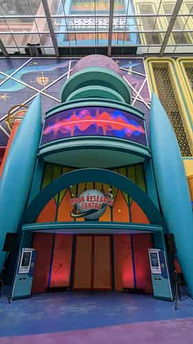 The walkway leads into a cartoony futuristic themed area, though this zone has no actual attractions.
