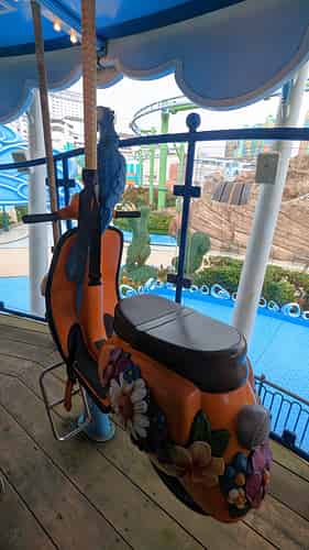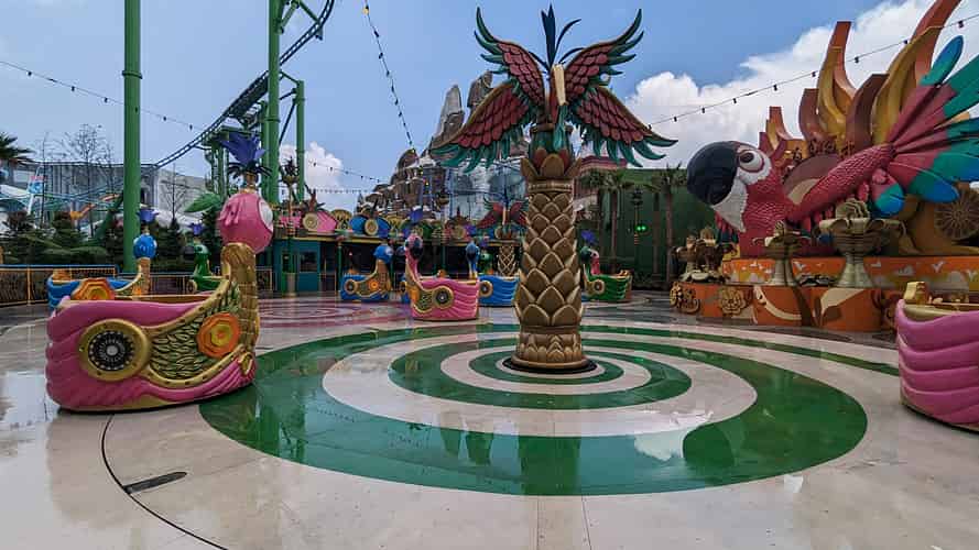 A huge parade float dominates the backdrop of the ride.