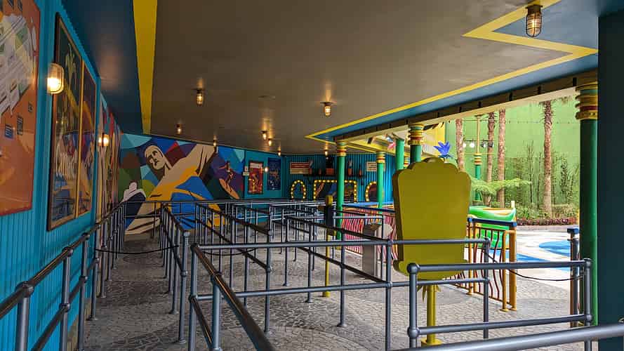 The queue is themed like a backstage area for Carnival performers.