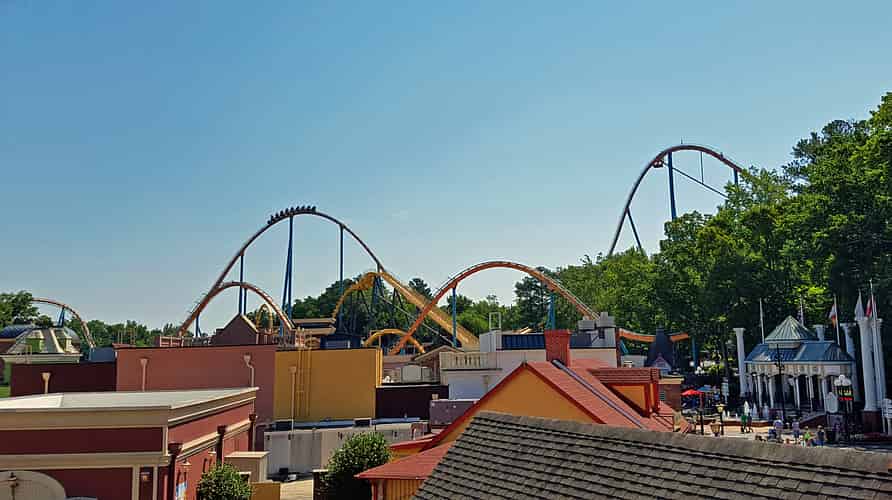 Two B&Ms....Goliaths first airtime hill passes cleanly over the top of Georgia Scorcher, somewhat dwarfing it.