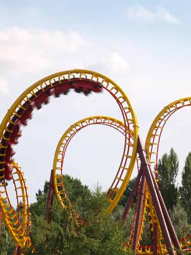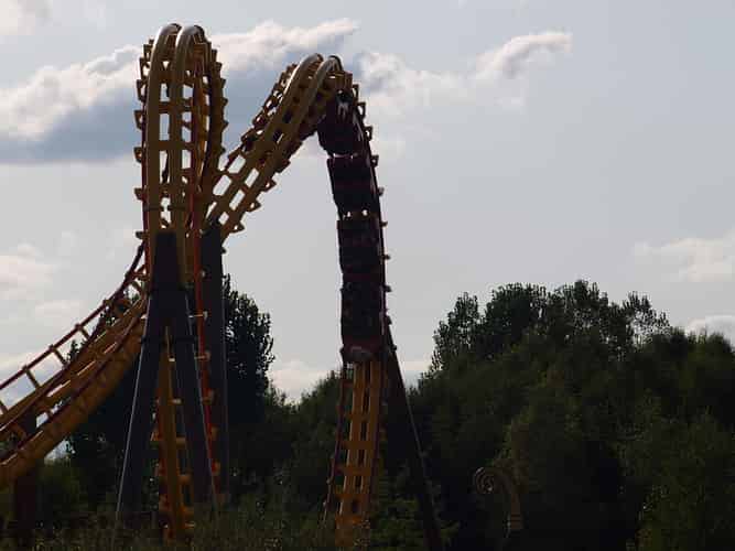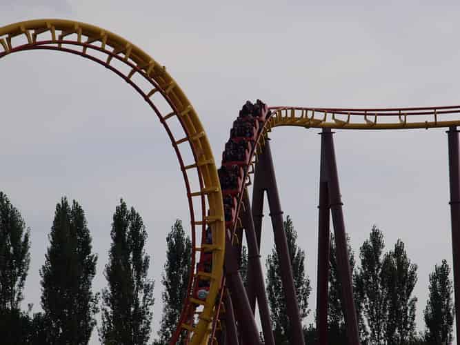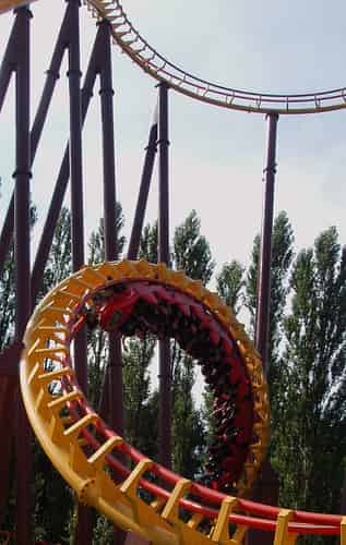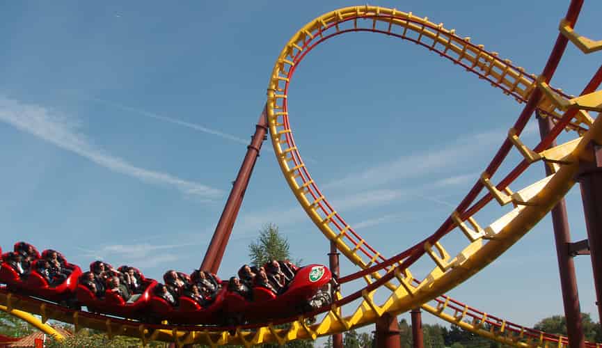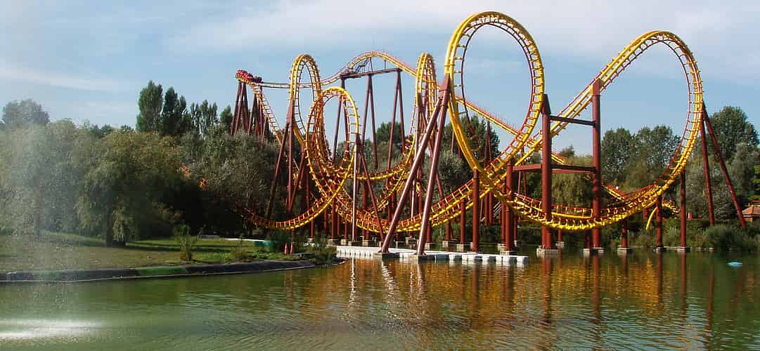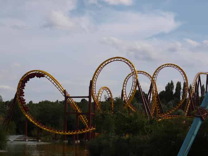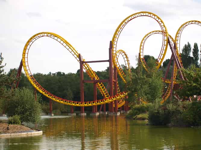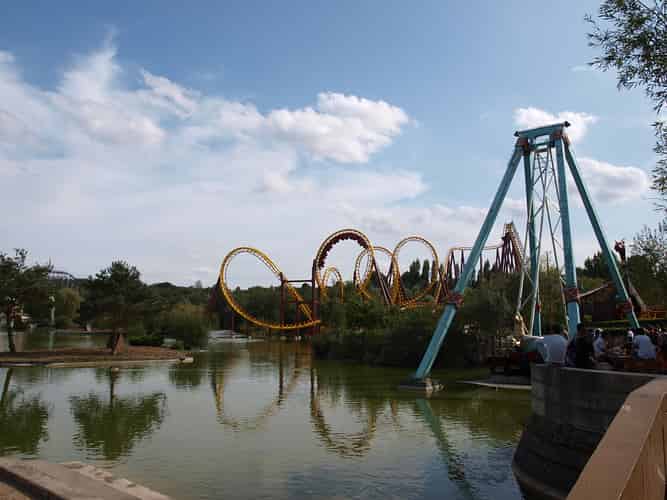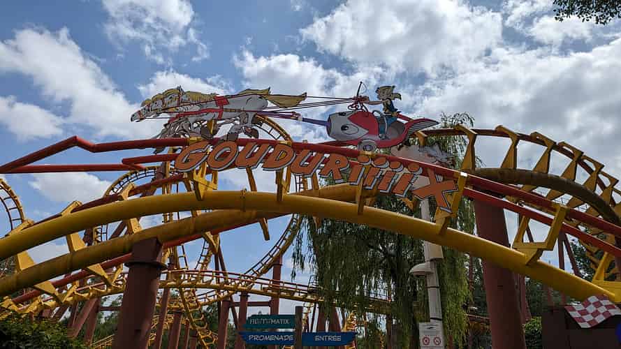 The Looping Coaster "Goudurix", with the Swinging Ship "La Galère" to the right.