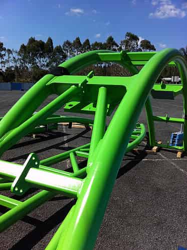 More green track has shown up at Movie World. Here we have the first piece of the lift hill, with the anti-rollback teeth in all their jagged glory.