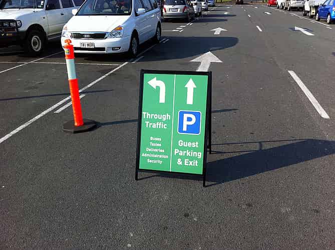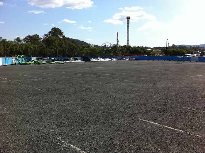 With Green Lantern's track and supports being stored on the carpark and park entrance road, green signage directs traffic to safety.