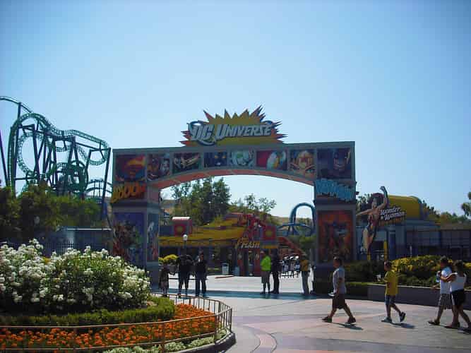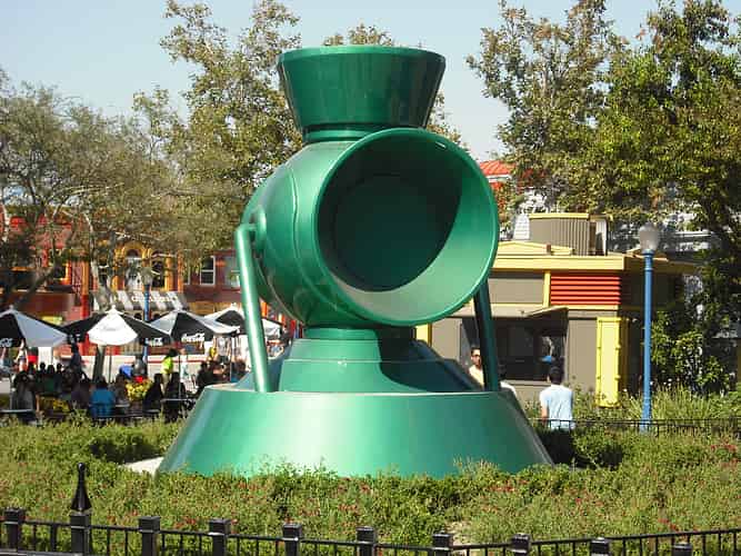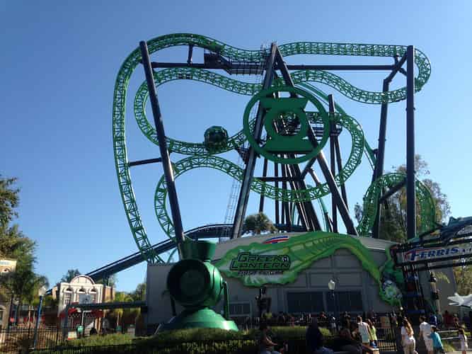 The entrance to the ride is marked by a giant Green Lantern power battery.