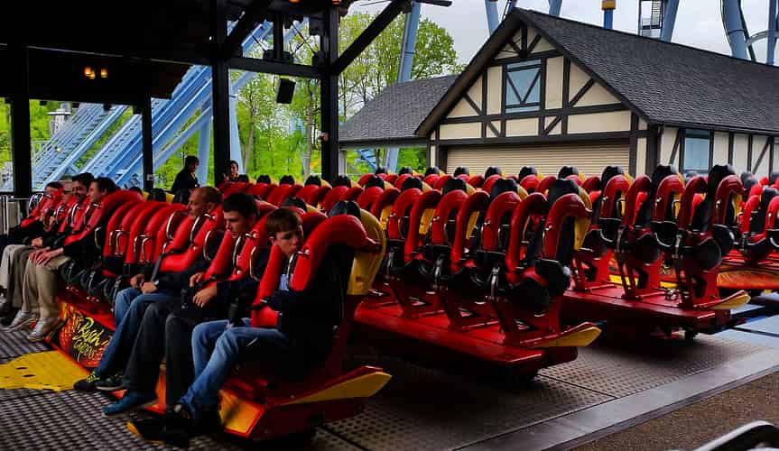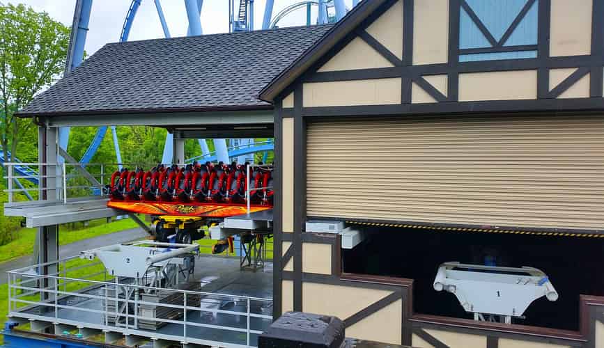 The trains are floorless. When the train parks a floor rises up below the train to allow guests to board. Before dispatch, the floor drops down again, leaving guests with dangling feet.