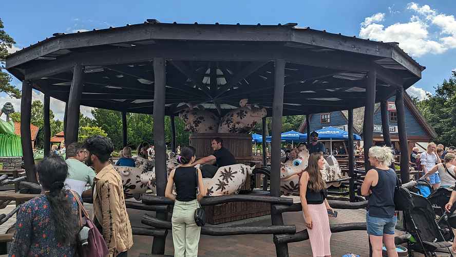 The same model as the Frøerne ride next to it, guests ride in pigs that quickly bounce as the ride revolves.
