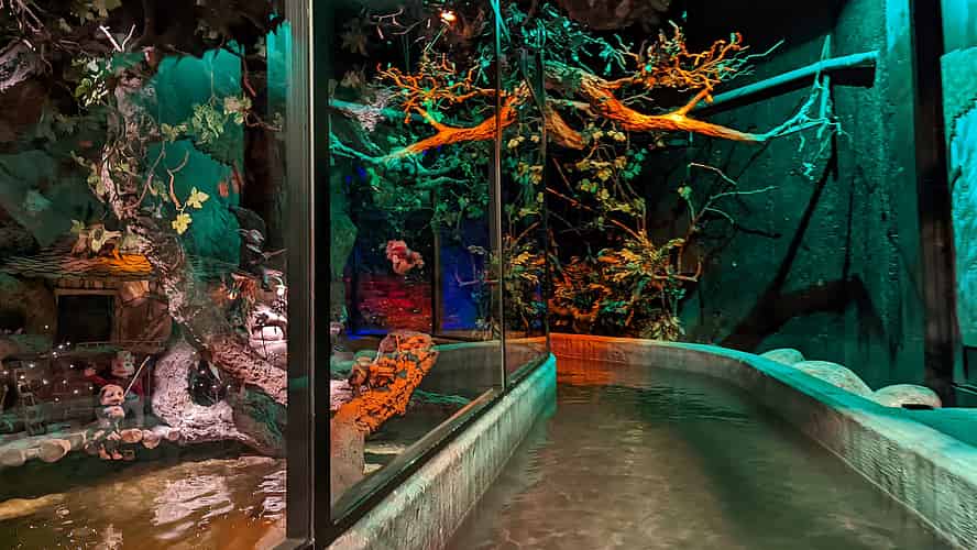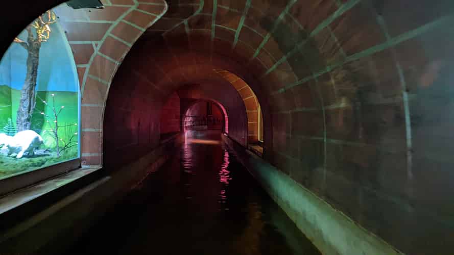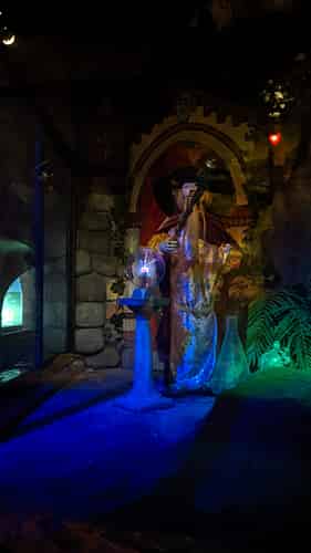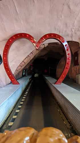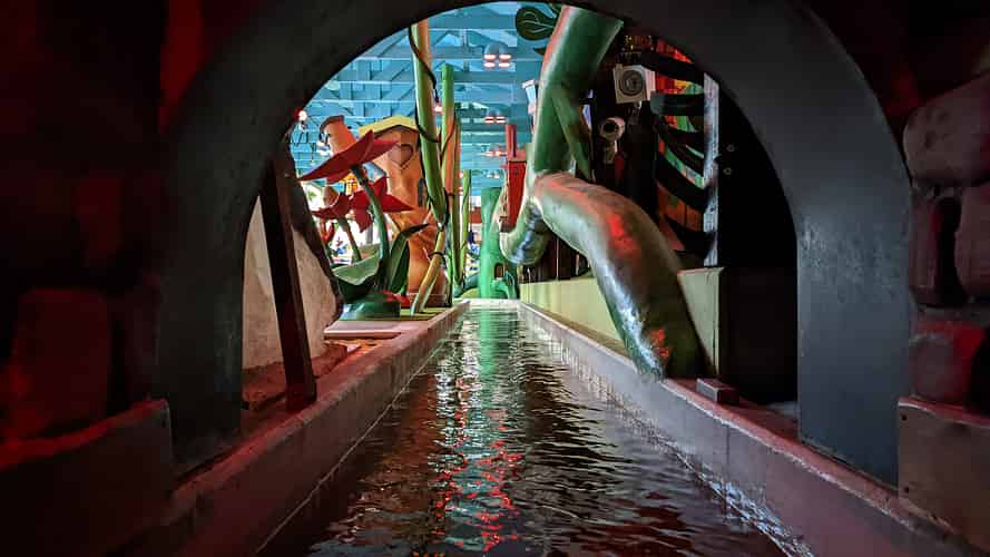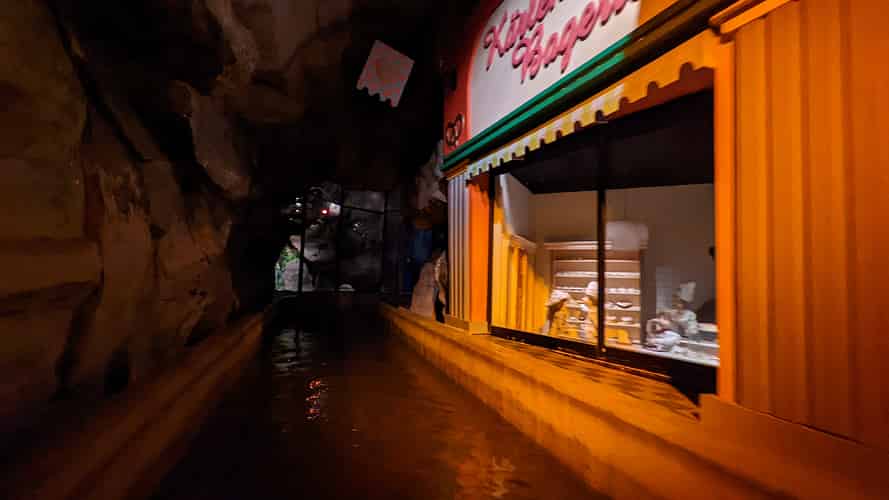 The outside of the ride is incorporated into the streetscape, with record and music store faux shopfronts.