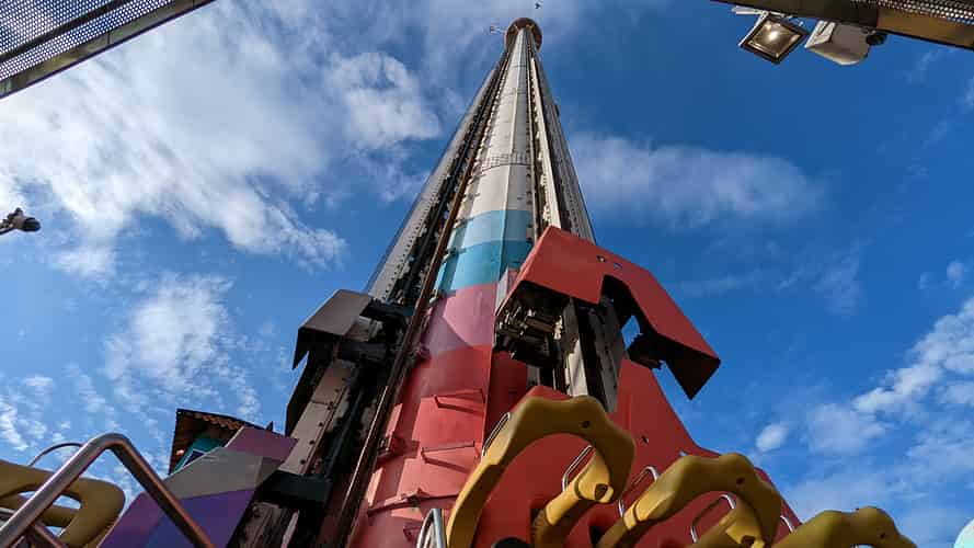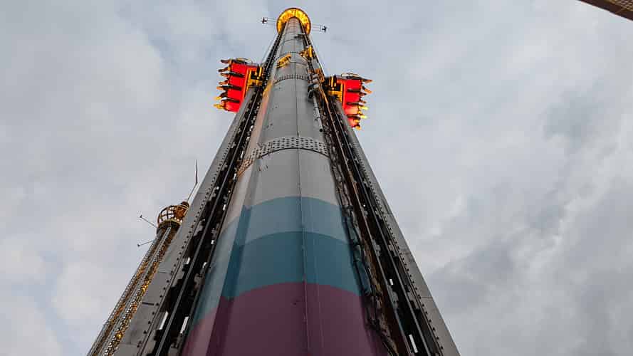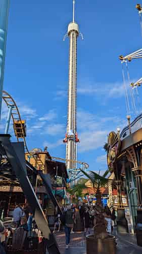 Fritt Fall is an Intamin freefall tower offering both sit down and 'stand up floorless' seating options.
