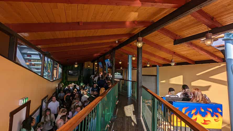 The queue line winds through spaces themed like underground utility tunnels.