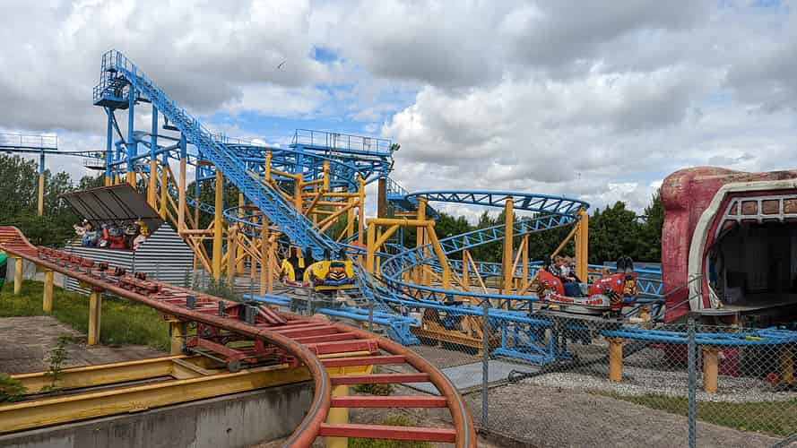 A few traditional wild mouse turns follow the first drop and get the car spinning.