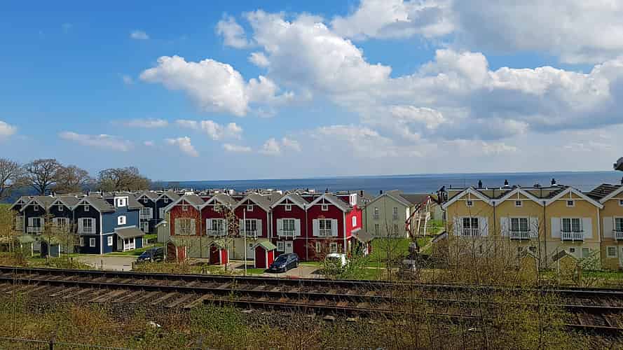 The Hansa Park Holiday resort is at the back of the park, on the seafront, linked over the railway tracks via a pedestrian overpass.