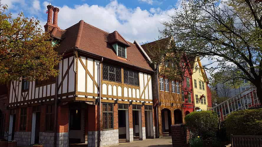 The entrance plaza features a mix of facades that pay tribute to the cites in the Hanseatic League.