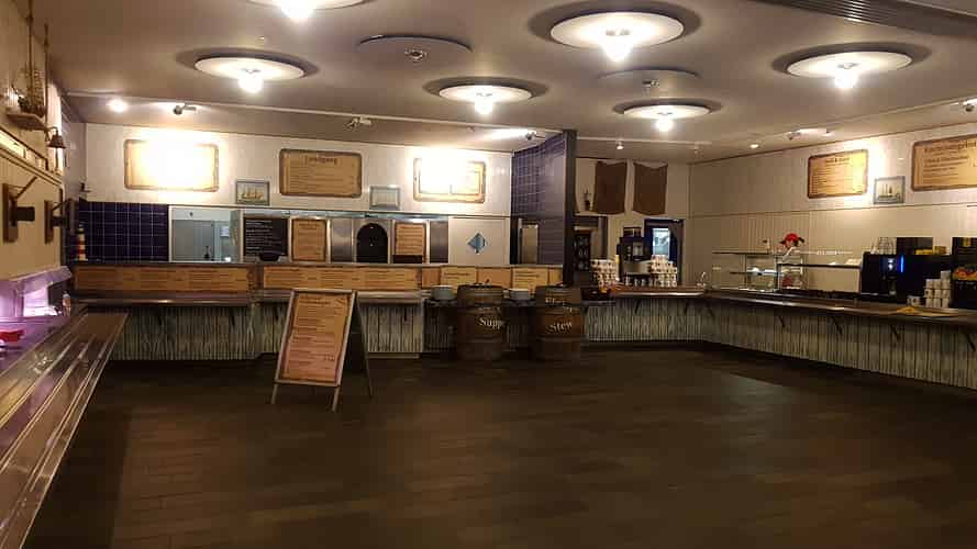 A large cafeteria with a good mix of food options is available.