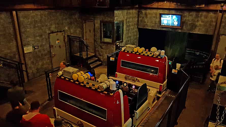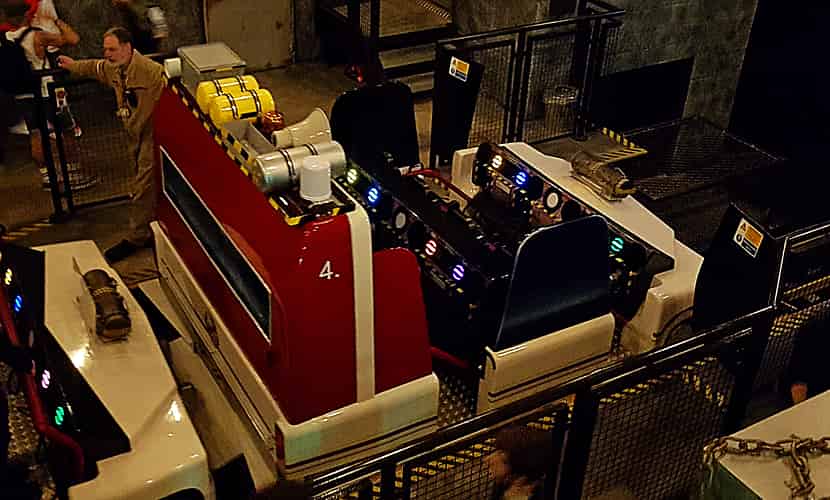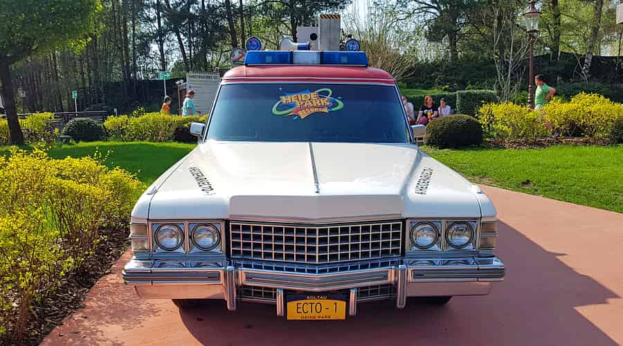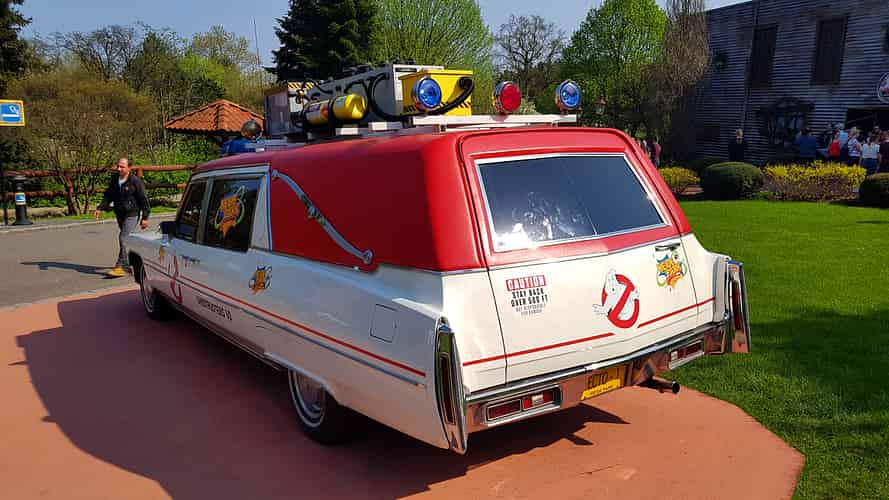 The ride vehicles are a recreation of the ECTO-1 and feature a spinning base.