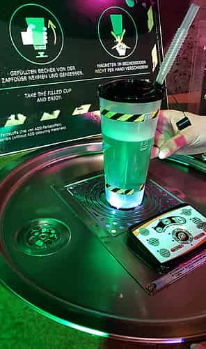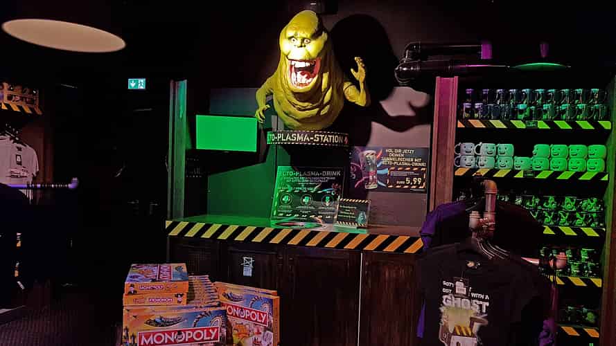 You can purchase a green Ectoplasm soft drink, filled by a unique bottoms up filling system. Essentially the bottom of the cup has a hole sealed by a circular magnetic disc. When you put the cup on the magnet is lifted up slightly, allowing the drink to flow in.