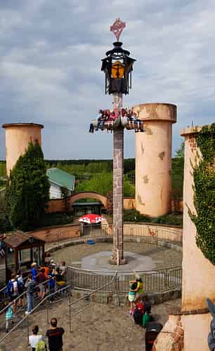The ride fits into the Transylvania area so there's quasi spooky looking theming like spikes and pagan symbols.