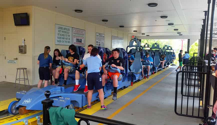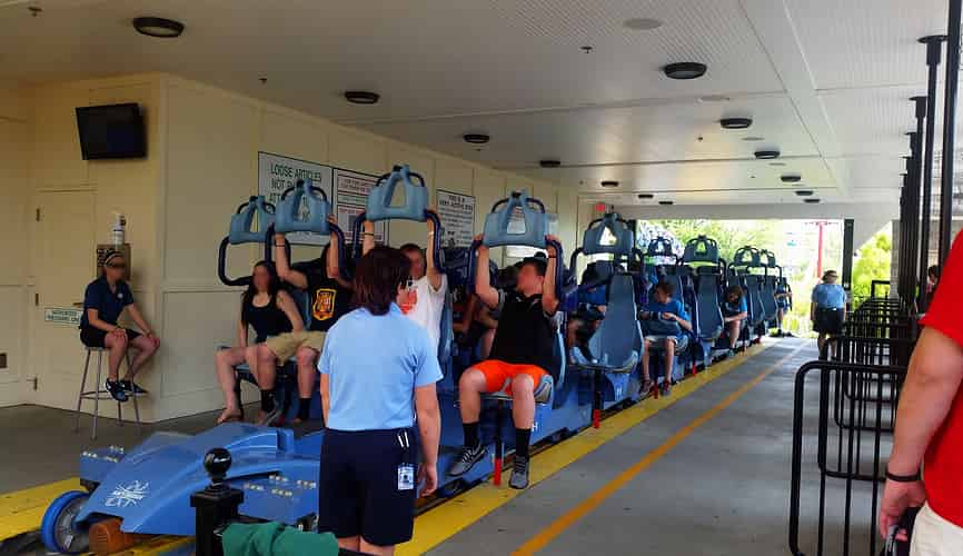 Riders are held in with an overhead lap bar that rests on the thighs.