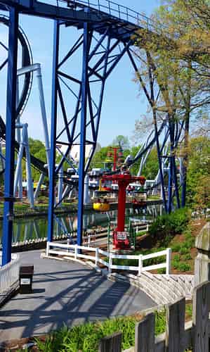 After the Zero G Roll are a few flowing turns, and a cross over the creek. Note the long horizontal support holding the track over the water.
