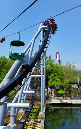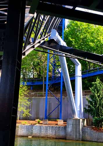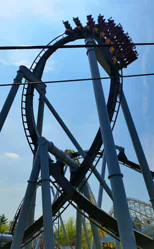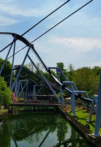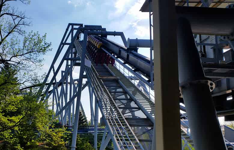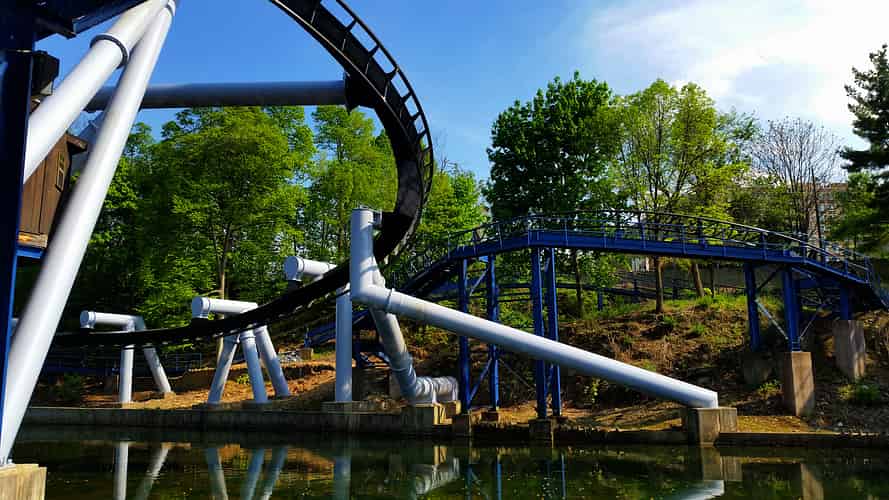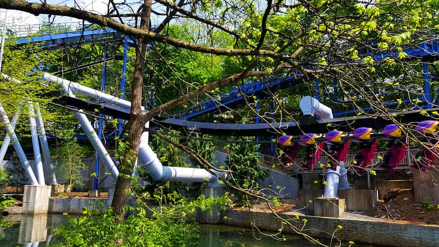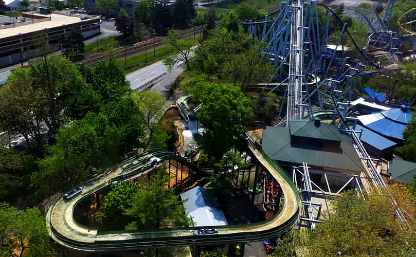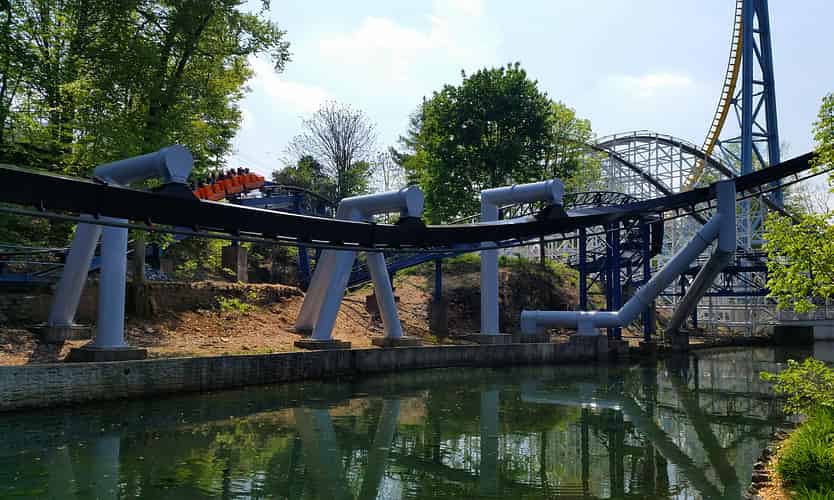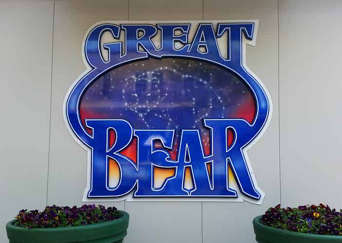 Great Bear (Like many coasters in the park) has a somewhat convoluted layout that ducks and weaves around terrain features and other rides, such as superdooperLooper.