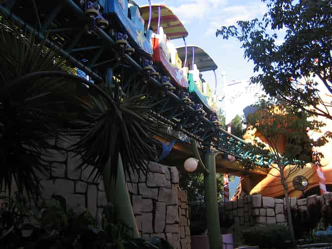 Originally the ride was to be called Sylvester's McMonkey McBean Unusual Driving Machines, with individual vehicles following the monorail beam. The original ride manufacturer went bankrupt, so Mack Rides later came and provided a more conventional track on top of the original beam.