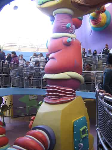 A wacky machine in the queue. There are a couple of buttons mounted on the ramp railings that activate some of its features.