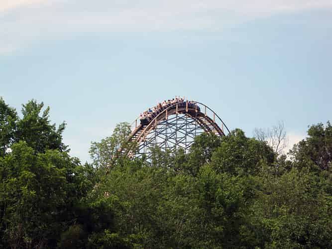 The coaster's airtime-filled first camelback hill rises with ease above the surrounding forest.