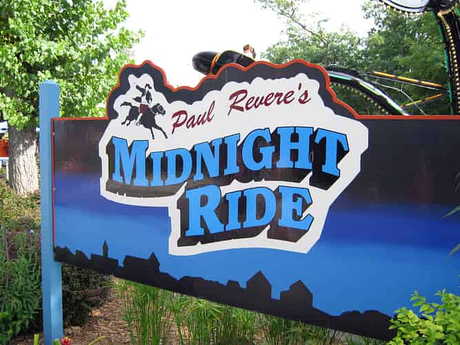Many of Holiday World's attraction names are quite a stretch in an effort to make them fit the area's theme -- such as the obtusely named Paul Revere's Midnight Ride situated in the Forth of July section of the park.