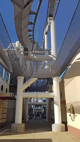 To reduce the footprint, many parts of the ride are stacked over each other.