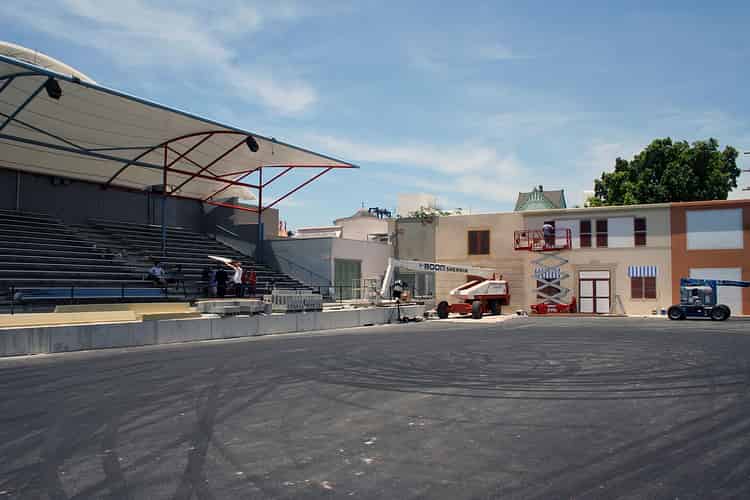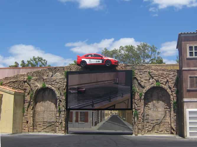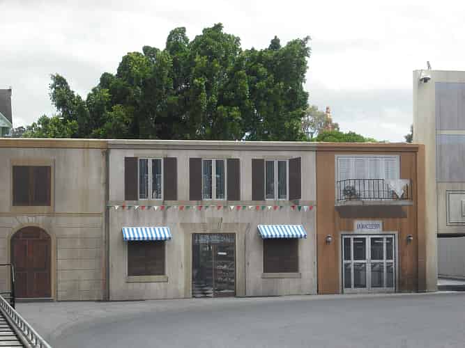 Heres one we only just noticed. Have a look at the way the rear windows of the shop backdrop have a leafy tree painted in the background, which happens to match the eixsting tree outside the arena. Nice.