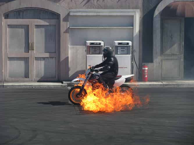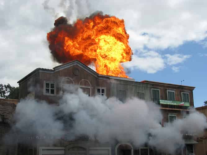 The climax of the show, where the car makes a long jump across the arena and crashes into a building.