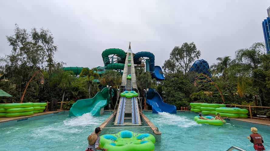 Both slides passing over the Kopiko Wai lazy river.