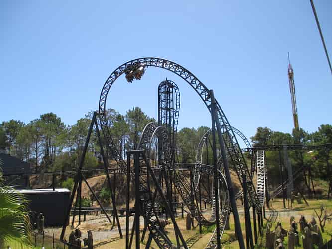 Like the other thrill rides it is clustered with, it has a demonic spooky theme.