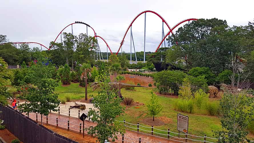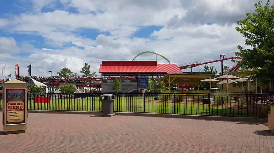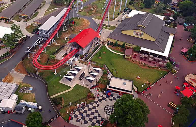 The southeastern side of the park, where we can see Nighthawk, RipCord, Flying Ace Aerial Chase, Windseeker, Intimidator, Southern Star and Afterburn