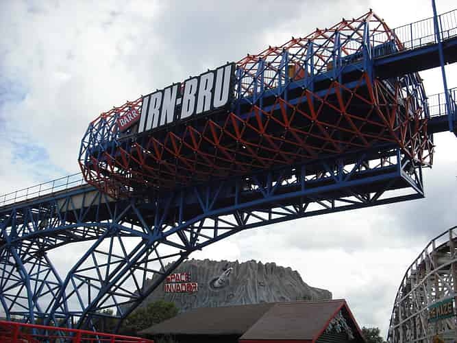 Irun Bru Revolution is another theme park rarity these days...The Arrow Dynamics Launched Loop, where trains are launched over a drop with an intense moment of airtime, through a loop, up a hill to a flat section of track, where a second launch sends them back through it all.