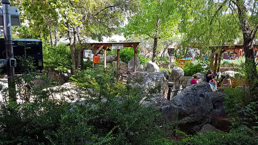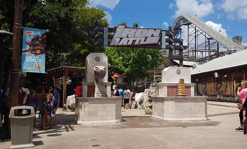 Signage above hints at a "rattlesnake roundup". The orange sign reads "Six Flags Fiesta Texas dedicates the Iron Rattler Coaster in honor of all American Coaster Enthusiasts worldwide. We appreciate ACE's unwavering spirit and support of the Six Flags family, we are thrilled to salute you June 1, 2013.