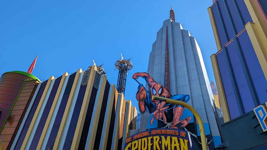 Forced perspective skyscrapers at the entrance of The Amazing Adventures of Spiderman.
