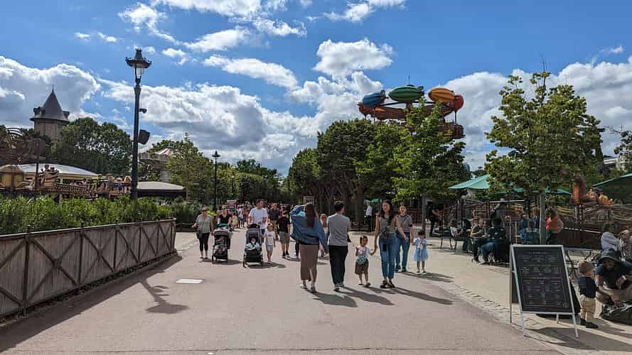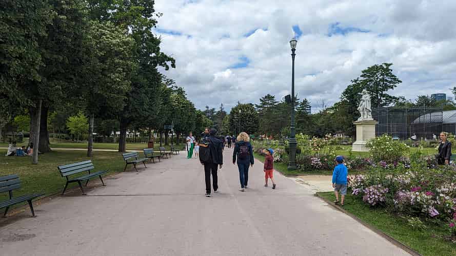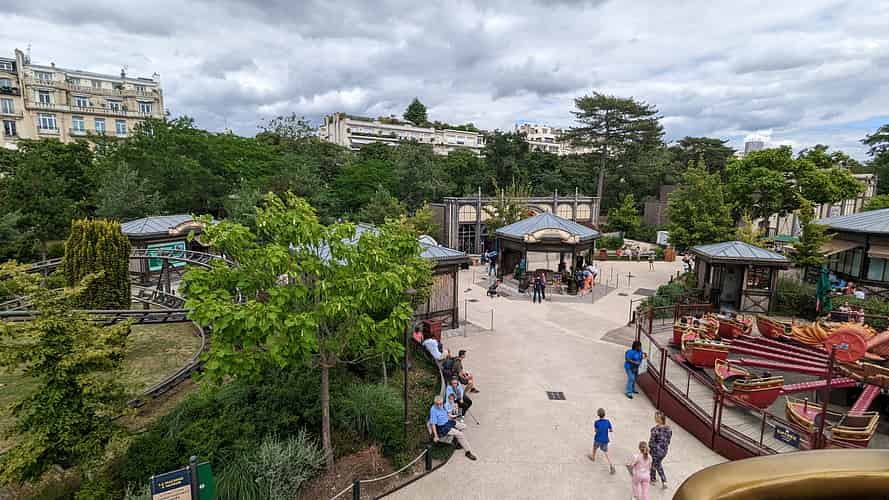 Most of the rides at Jardin D'acclimatation are clustered along a central promenade.