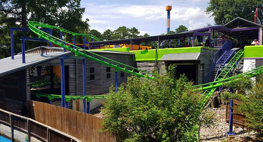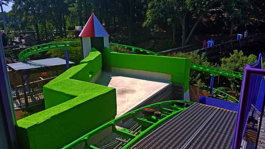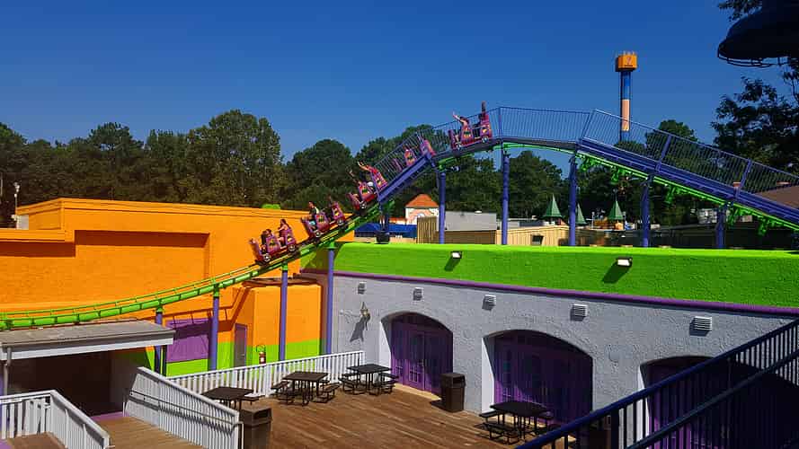 Joker Funhouse Coaster is a family coaster with a unique layout that winds around some existing buildings.
