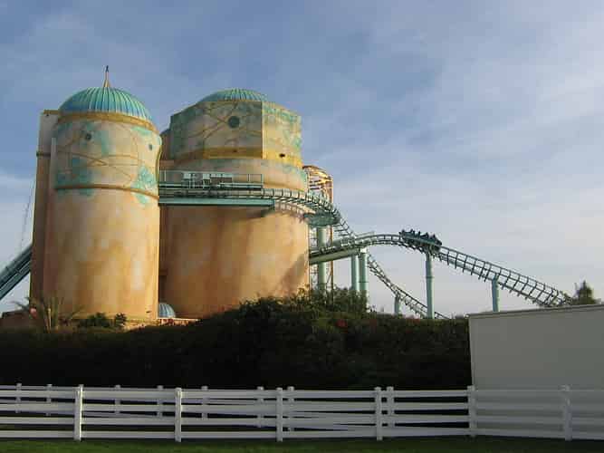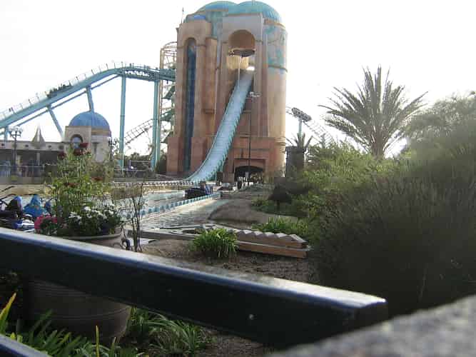 Here the rides' unique features come into play. A vertical lift (Similar in nature to the one on the Scoody Doo Spooky Coaster) brings boats to the top, where they then twist down the drop, pull 3g's at the bottom, before banking around and up into the block brakes.(The turn that connects the first lift hill to the first drop can also be seen)