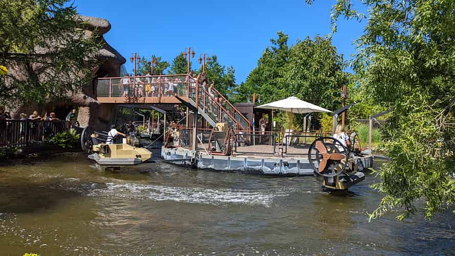 Jungle Racers has guests riding in airboat themed cars arranged around a turntable.