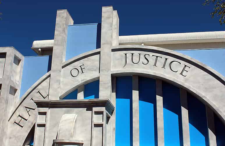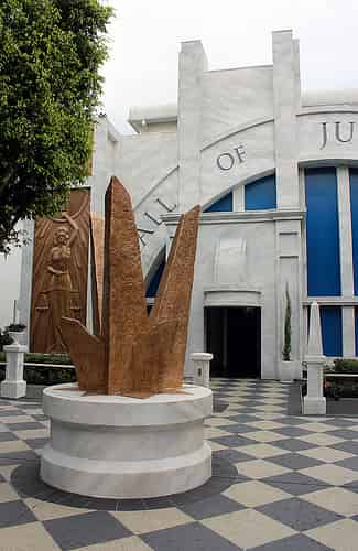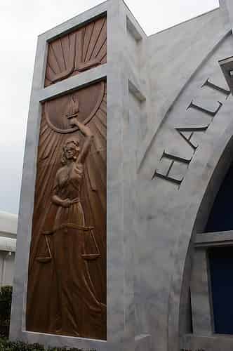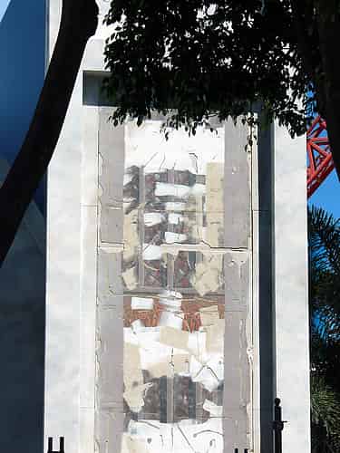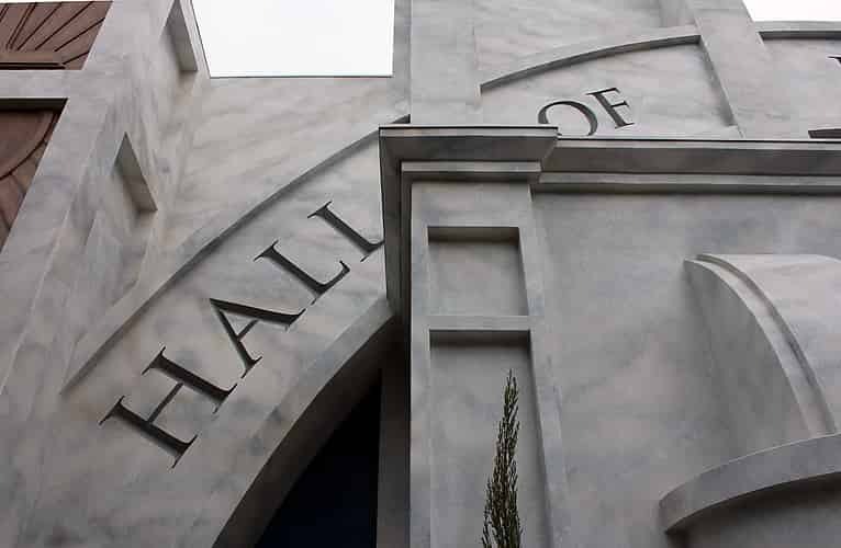 The facade for Hall of Justice is in place. Rather than design from scratch, the old Wayne Manor structure was used causing this unusual off-centre signage.