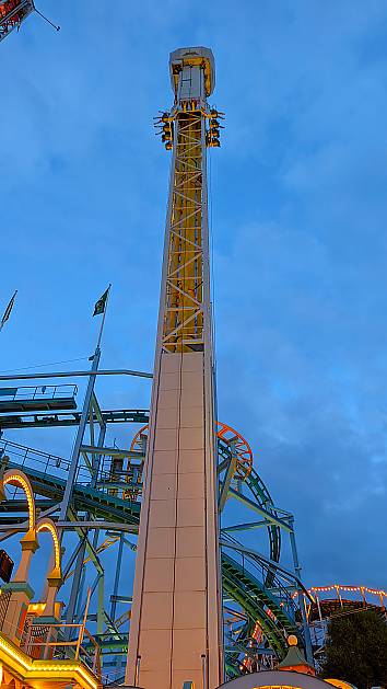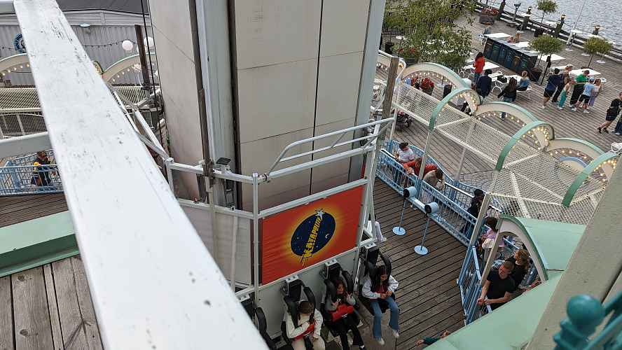 It combines the ride motions of a Space Shot and a Turbo Drop. You are launched to the top of the tower (rather than a slow ascent) held at the top, and then launched back towards the ground, followed by several up and down bounces.