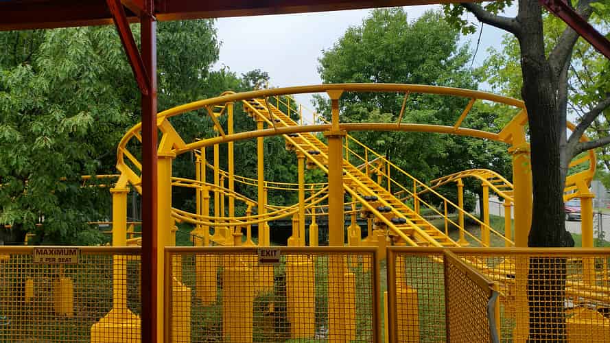 The latter part of the ride consists of a low to the ground slalom of turns, and 3 bunny hills in a row below the lift hill.