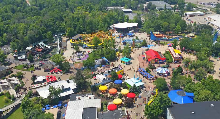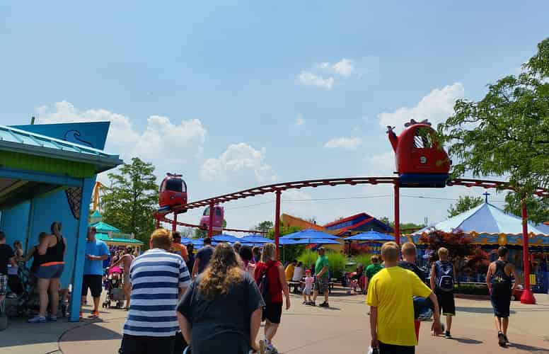 Guests use pedal power to propel the Woodstock Whirlybirds helicopters around the track.