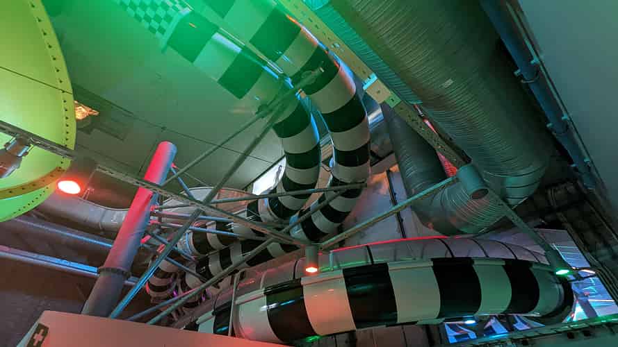 Your position is tracked throughout the ride, and an LED strip mounted on the roof of the tube glows green or red depending on your placing.
