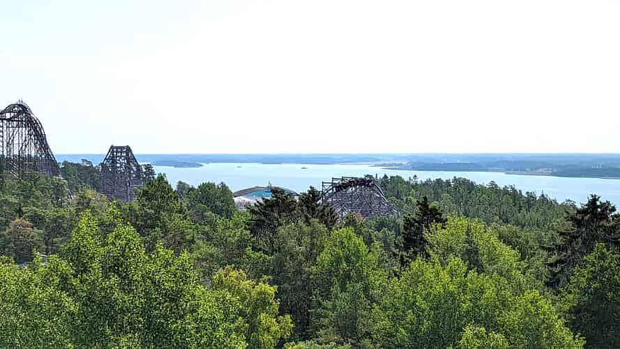 Sjorovarskeppet (Pirate ship) in front of Delfinexpressen (Family coaster) and Wildfire (Wooden Hybrid coaster)