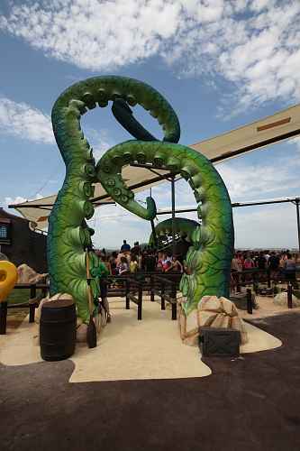 More pirate ship-themed shade sails were added after the opening of Kraken. Wait times, during busier periods, can be up to an hour.