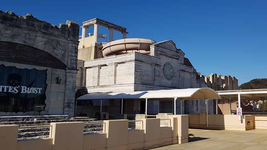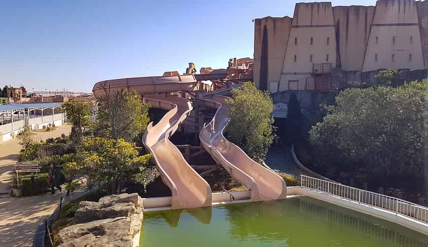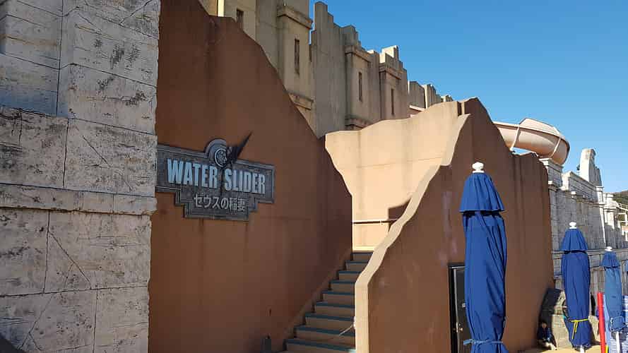 The indoor section features a number of themed temple chambers, and an encounter with a dragon. It culminates with a drop out of the building.