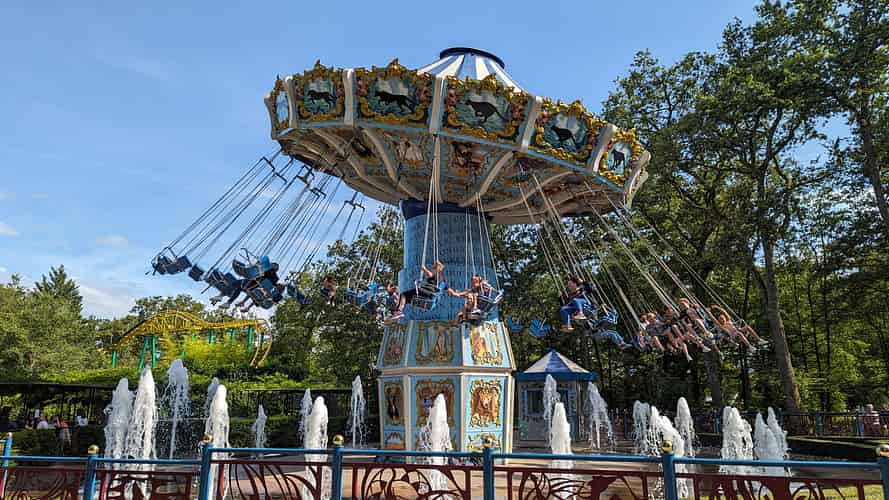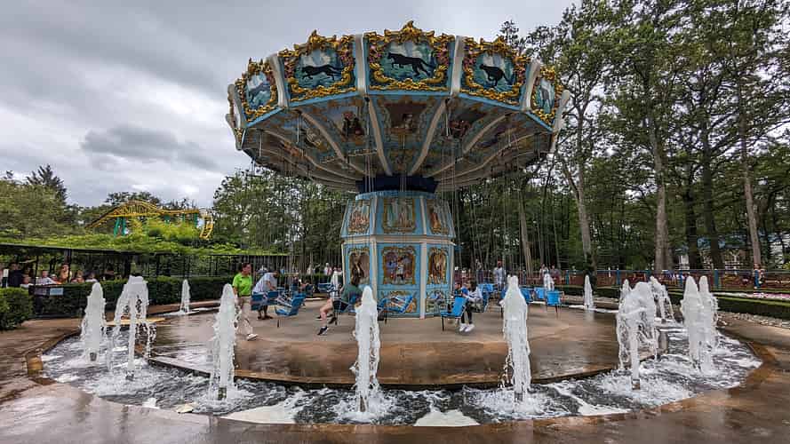 The wave swinger is surrounded by fountains.