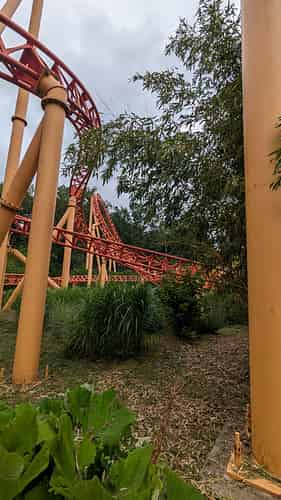 Dropping into the final turn. Notice too how in Europe rides often don't have heavy fences. Guests tend not to actively enter danger zones.
